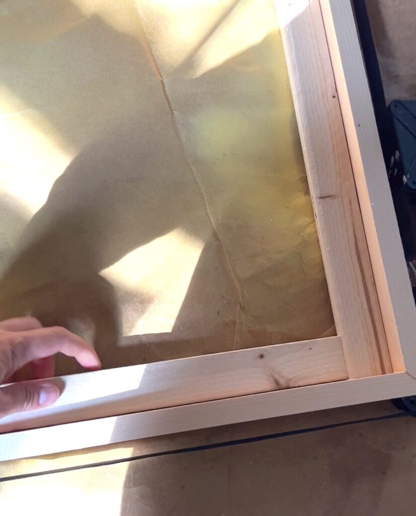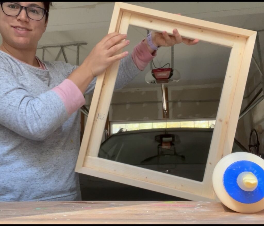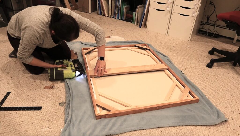 Once your frame is glued and dry enough to handle, you’ll want to glue and/or nail your 4 support wood pieces to be flush to the back of the frame so your canvas will sit right on top and have something to hold onto with screws in the next step.