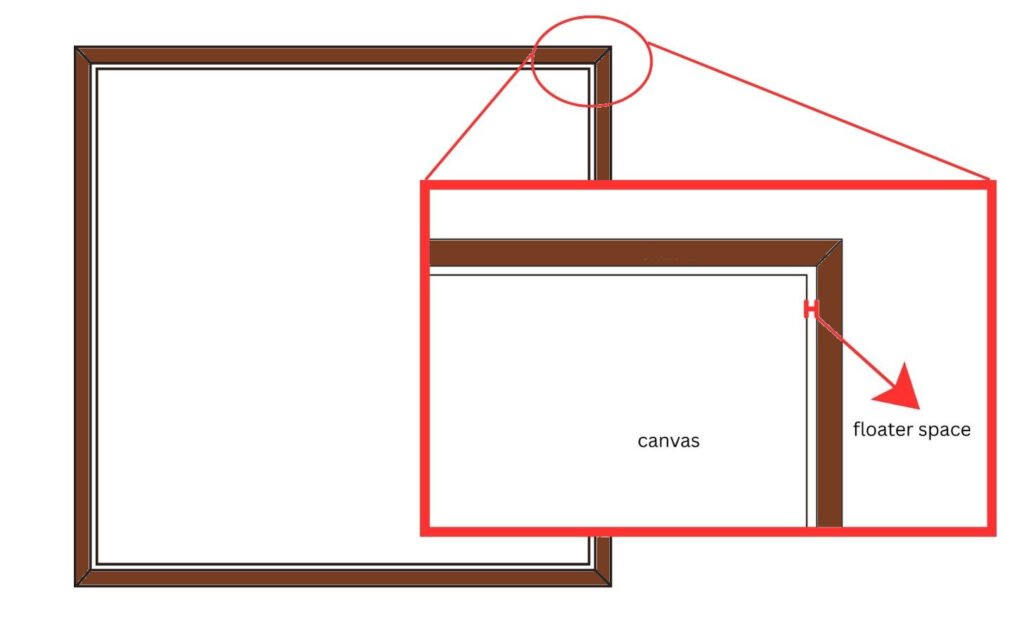 If you choose a floater space that is greater than 1/8″, it would be a good idea to make a backing for your canvas so it will still maintain the appearance of floating in the frame (and not show the color of the wall). Here’s an example of what I mean: